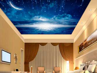 Натяжной потолок позволяет воплотить в жизнь самые креативные решения. С его помощью можно создать звёздное небо, выполнить объёмное изображение.